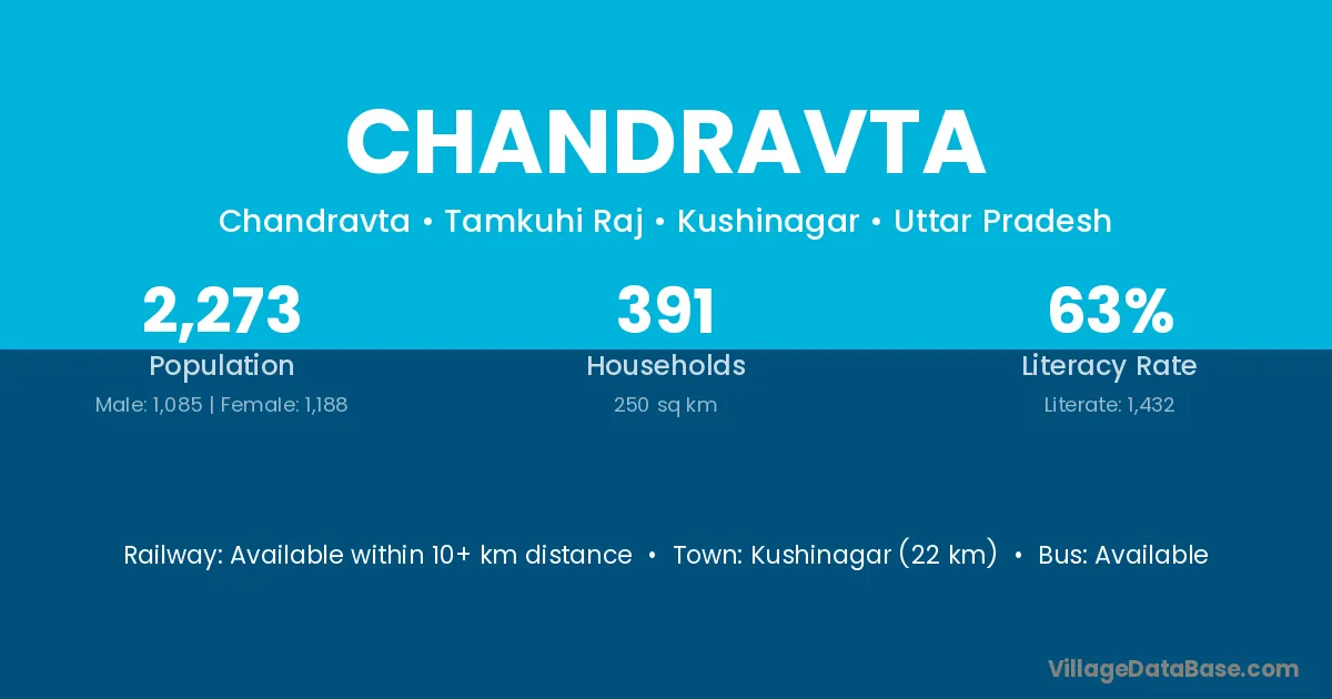 Kushinagar (22 km) is the nearest town to Chandravta village for major economic activities and is located approximately 22 km away.