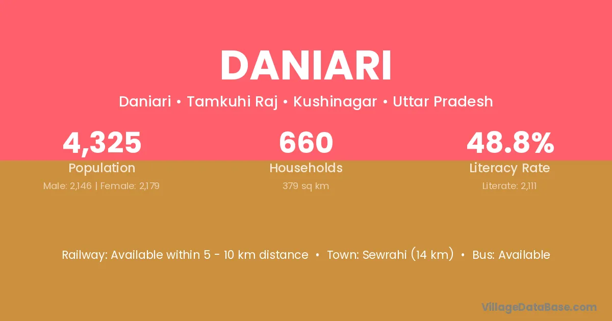 Sewrahi (14 km) is the nearest town to Daniari village for major economic activities and is located approximately 14 km away.