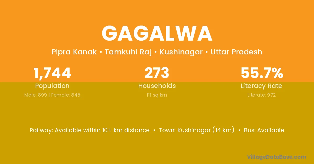Kushinagar (14 km) is the nearest town to Gagalwa village for major economic activities and is located approximately 14 km away.