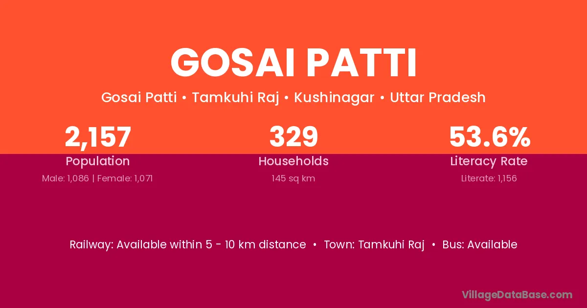 Gosai Patti village has a total population of 2,157 people, of which 1,086 are males and 1,071 are females.