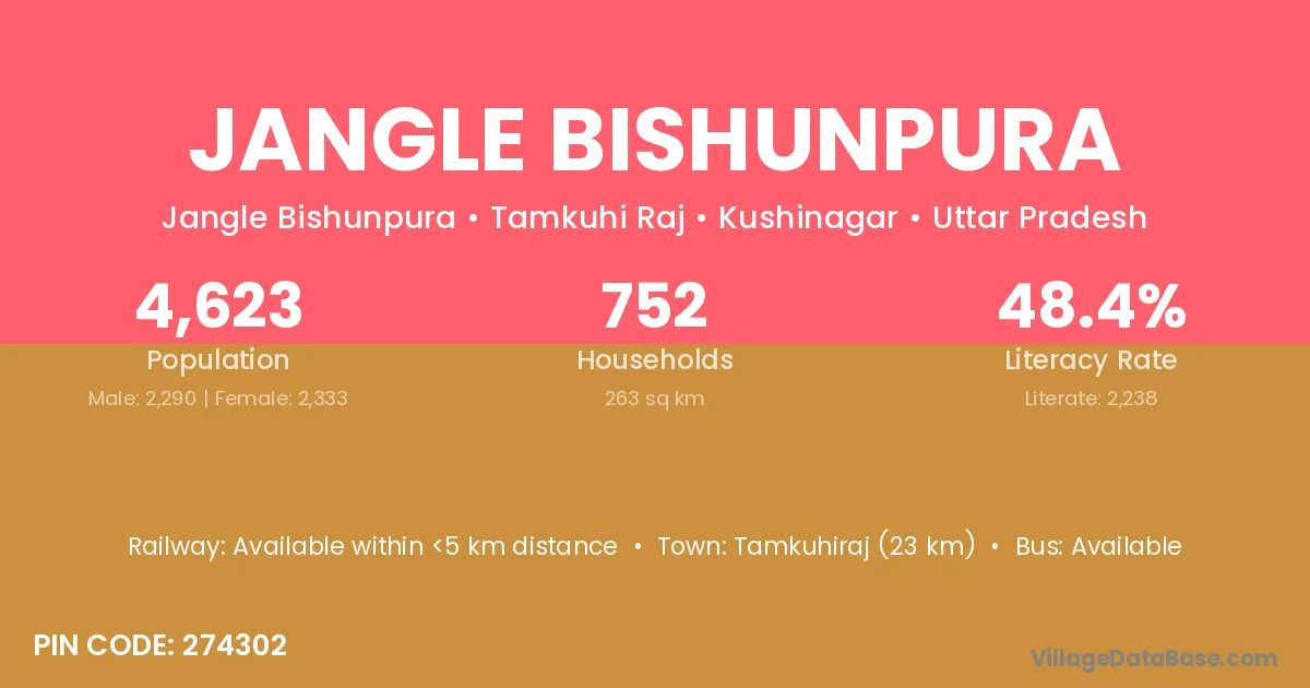 Tamkuhiraj (23 km) is the nearest town to Jangle Bishunpura village for major economic activities and is located approximately 23 km away.