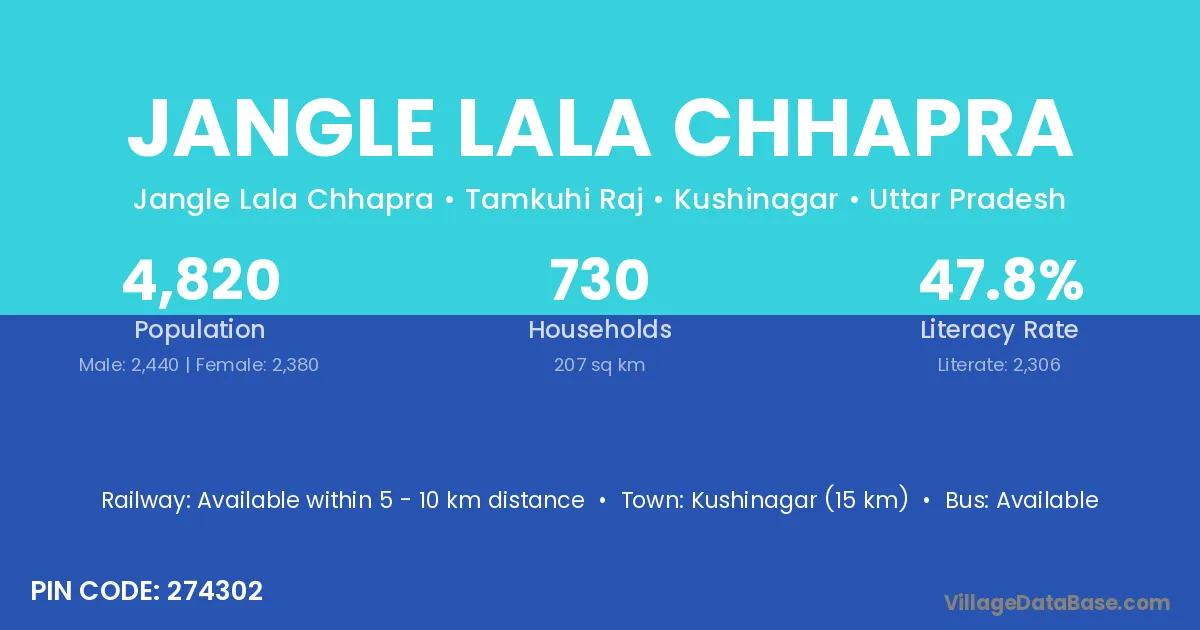 Kushinagar (15 km) is the nearest town to Jangle Lala Chhapra village for major economic activities and is located approximately 15 km away.