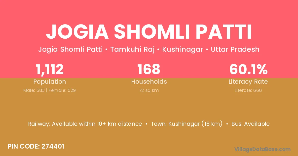 Kushinagar (16 km) is the nearest town to Jogia Shomli Patti village for major economic activities and is located approximately 16 km away.