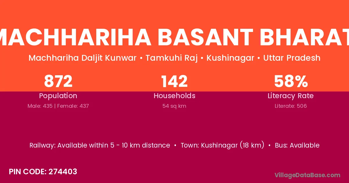 Machhariha Basant Bharati village has a total population of 872 people, of which 435 are males and 437 are females.