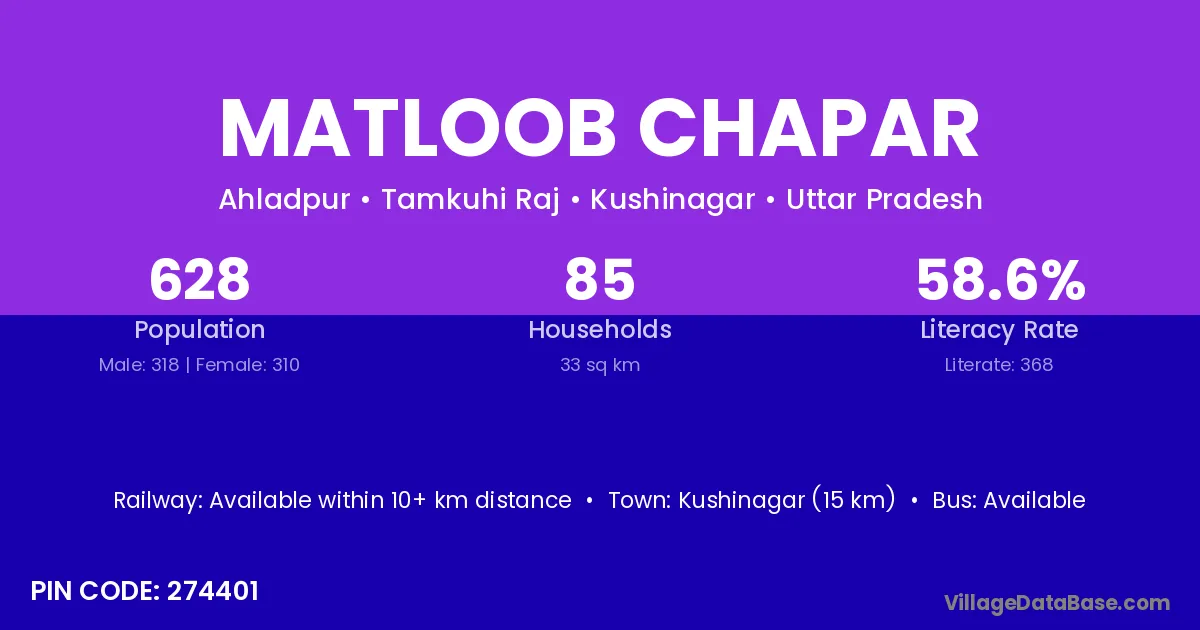 Kushinagar (15 km) is the nearest town to Matloob Chapar village for major economic activities and is located approximately 15 km away.