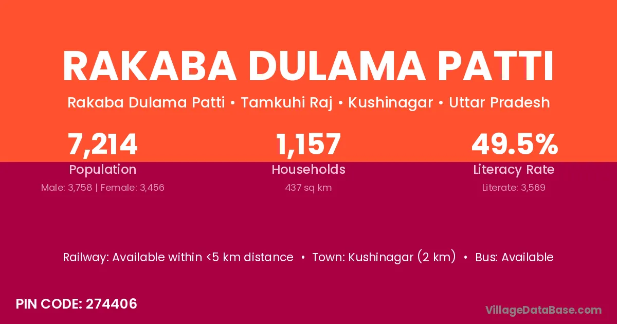Kushinagar (2 km) is the nearest town to Rakaba Dulama Patti village for major economic activities and is located approximately 2 km away.