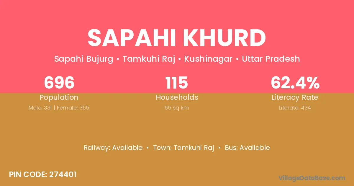 Sapahi Khurd village has a total population of 696 people, of which 331 are males and 365 are females.