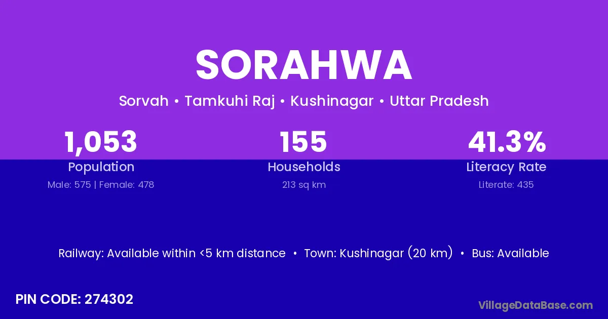 Kushinagar (20 km) is the nearest town to Sorahwa village for major economic activities and is located approximately 20 km away.