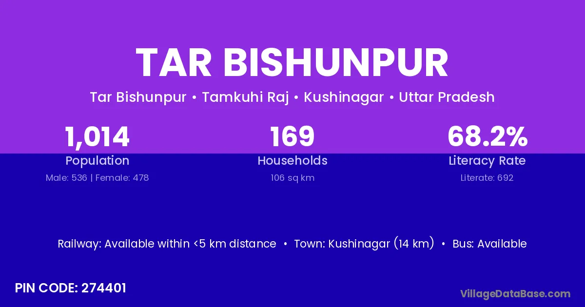 Kushinagar (14 km) is the nearest town to Tar Bishunpur village for major economic activities and is located approximately 14 km away.