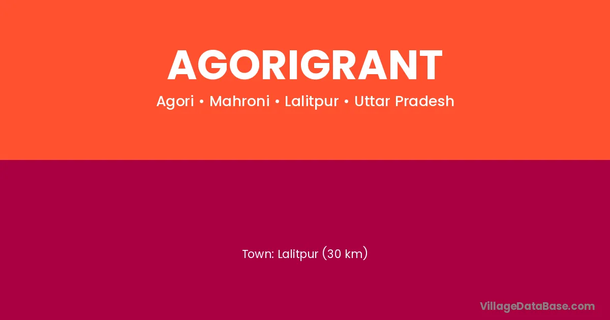 Lalitpur (30 km) is the nearest town to Agorigrant village for major economic activities and is located approximately 30 km away.