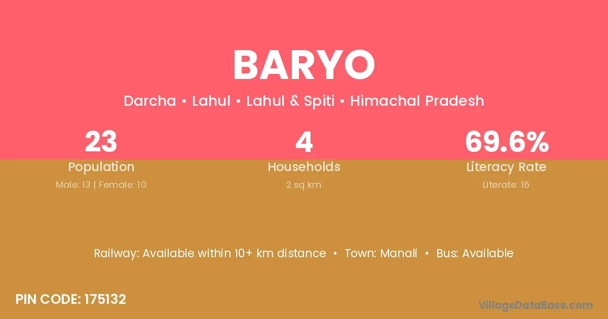 The literacy rate of Baryo village is 49.58%. Male literacy stands at 59.06% and female literacy at 39.13%.