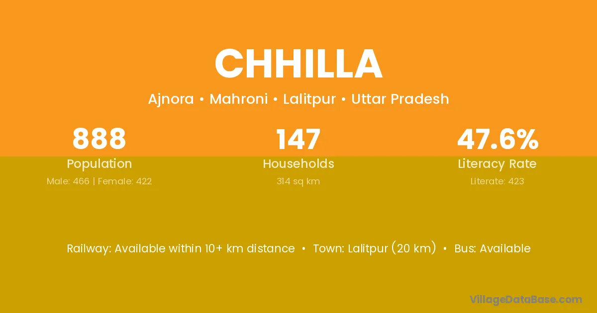 Lalitpur (20 km) is the nearest town to Chhilla village for major economic activities and is located approximately 20 km away.