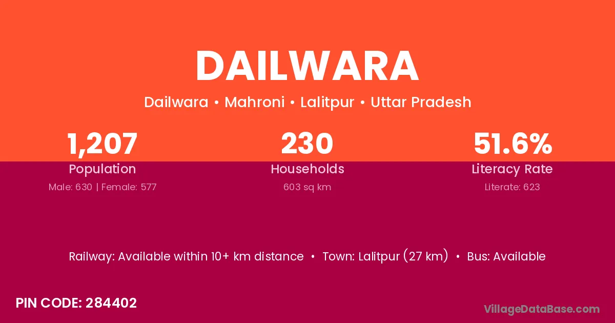 Dailwara village has a total population of 1,207 people, of which 630 are males and 577 are females.