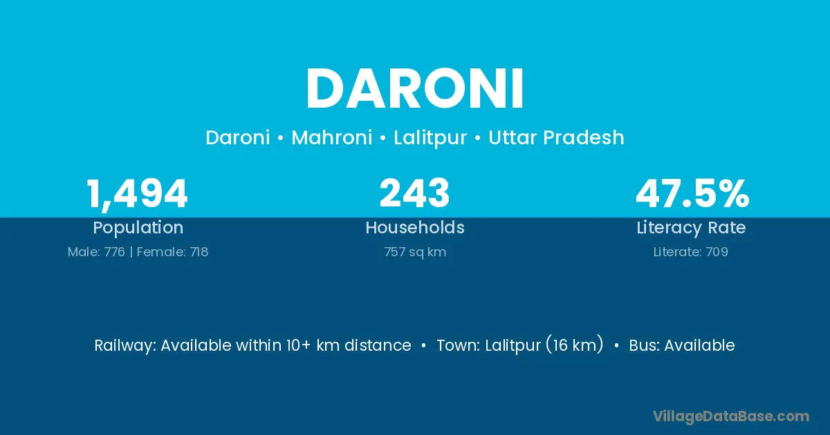 Lalitpur (16 km) is the nearest town to Daroni village for major economic activities and is located approximately 16 km away.