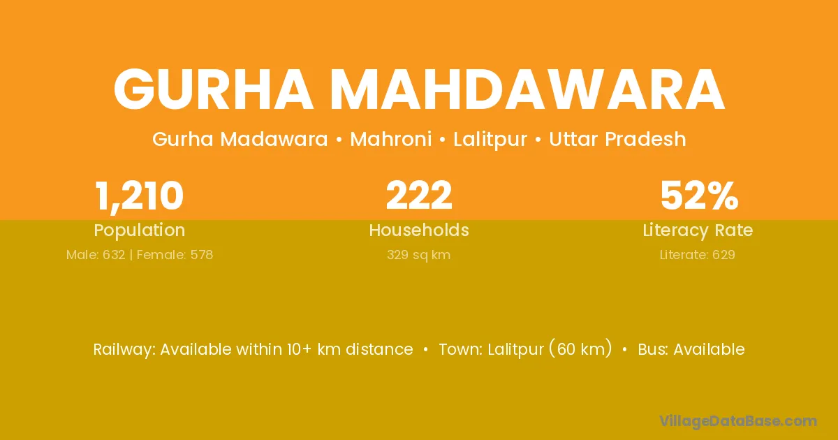 Lalitpur (60 km) is the nearest town to Gurha Mahdawara village for major economic activities and is located approximately 60 km away.