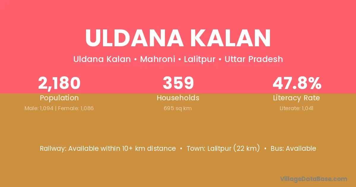 Uldana Kalan village has a total population of 2,180 people, of which 1,094 are males and 1,086 are females.