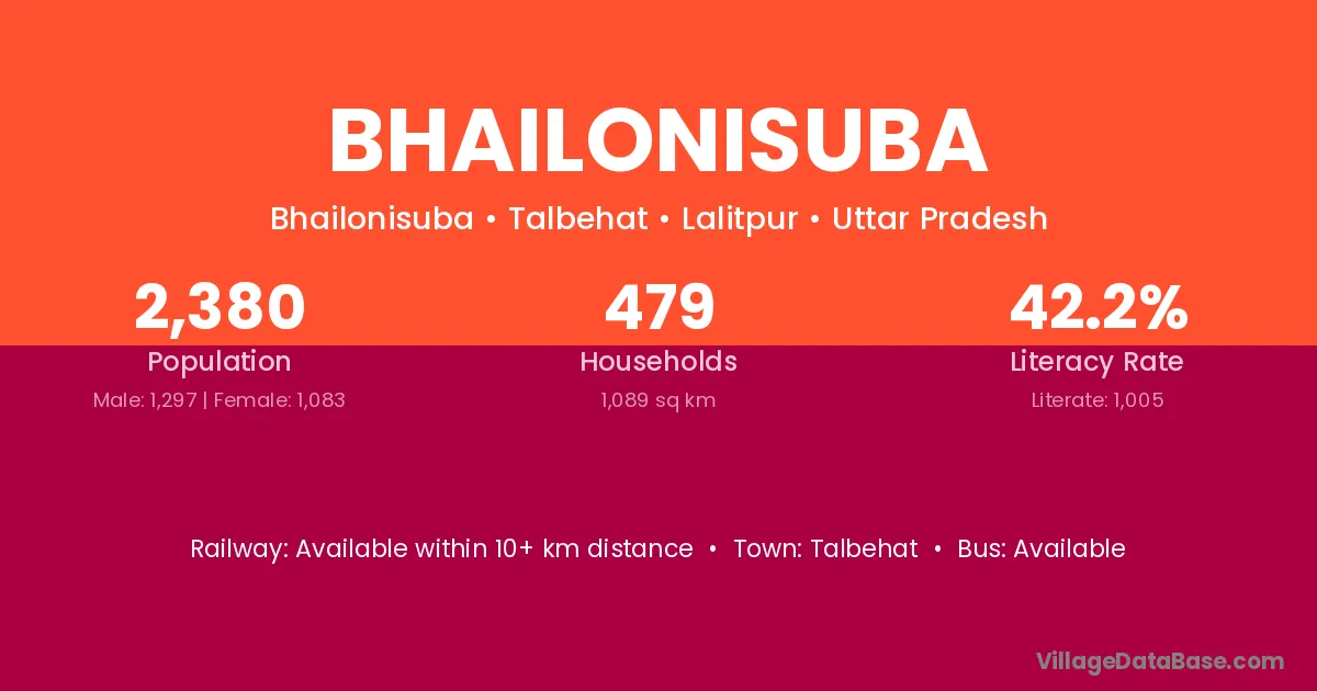 Bhailonisuba village has a total population of 2,380 people, of which 1,297 are males and 1,083 are females.