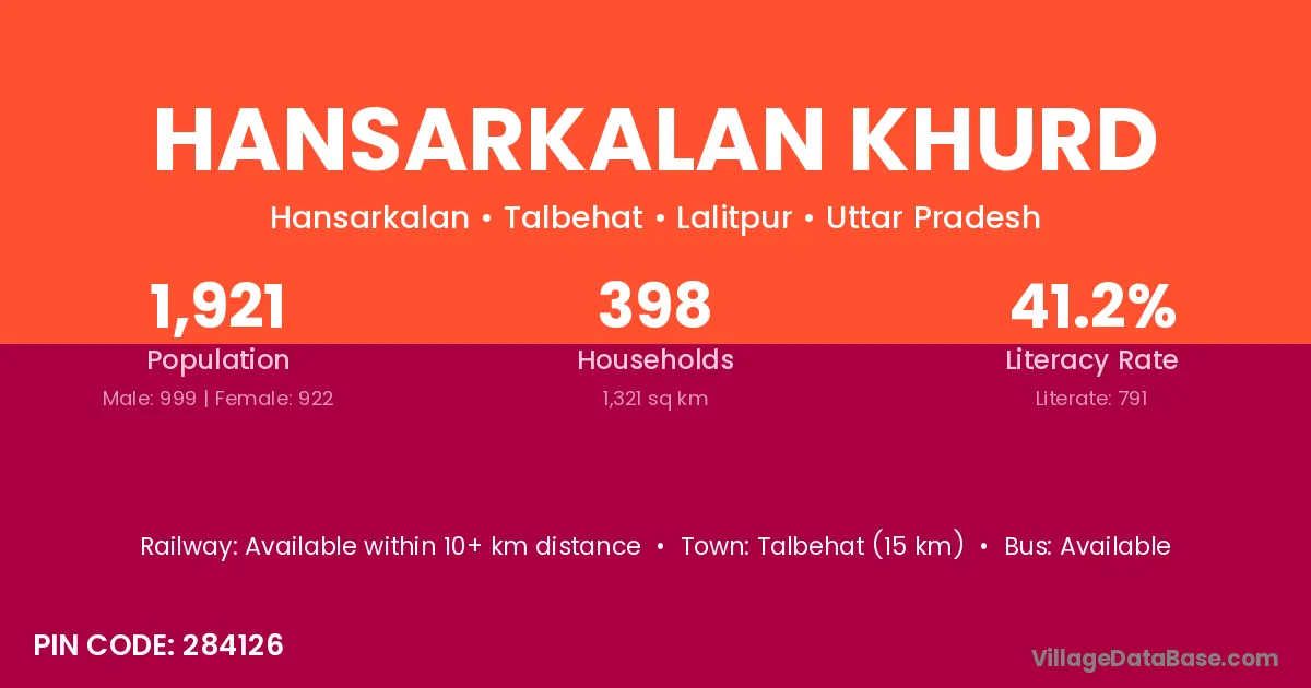 Talbehat (15 km) is the nearest town to Hansarkalan Khurd village for major economic activities and is located approximately 15 km away.
