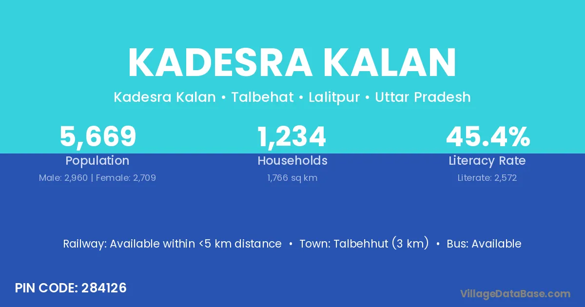 Kadesra Kalan village has a total population of 5,669 people, of which 2,960 are males and 2,709 are females.