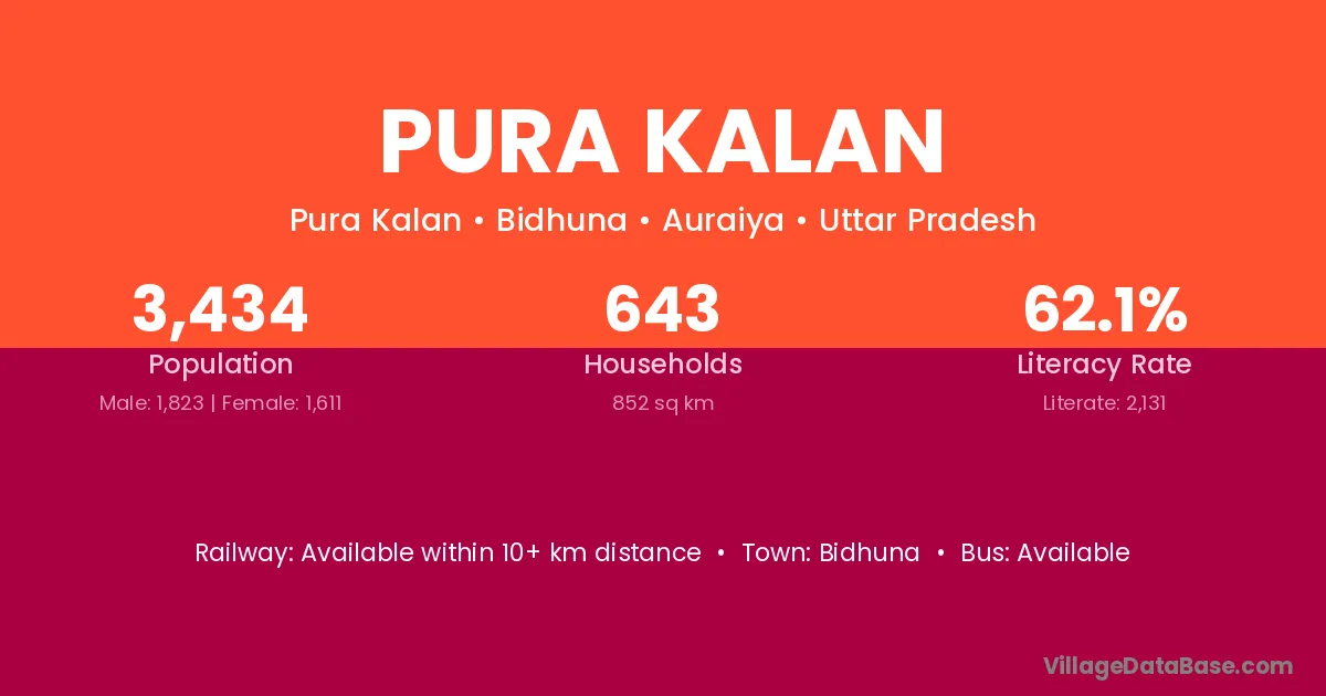 The literacy rate of Pura Kalan village is 44.19%. Male literacy stands at 52.92% and female literacy at 34.32%.