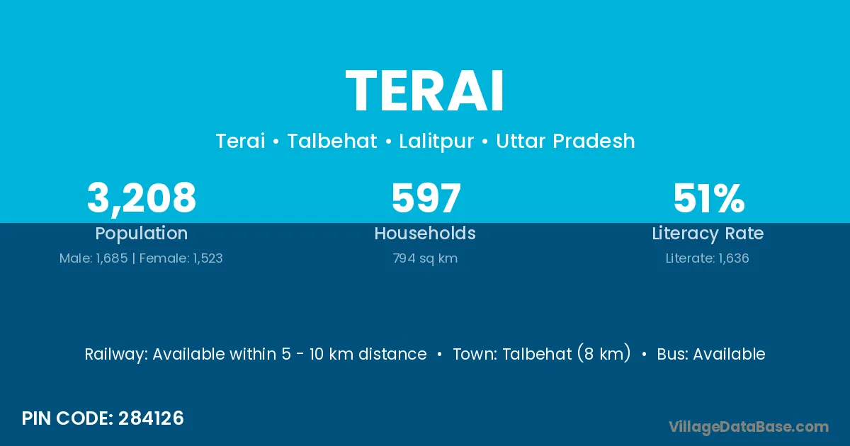 Terai village has a total population of 3,208 people, of which 1,685 are males and 1,523 are females.