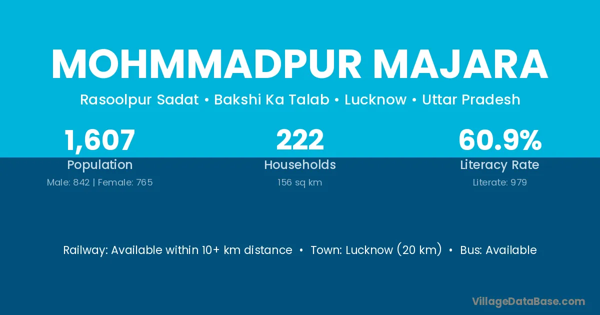Lucknow (20 km) is the nearest town to Mohmmadpur Majara village for major economic activities and is located approximately 20 km away.