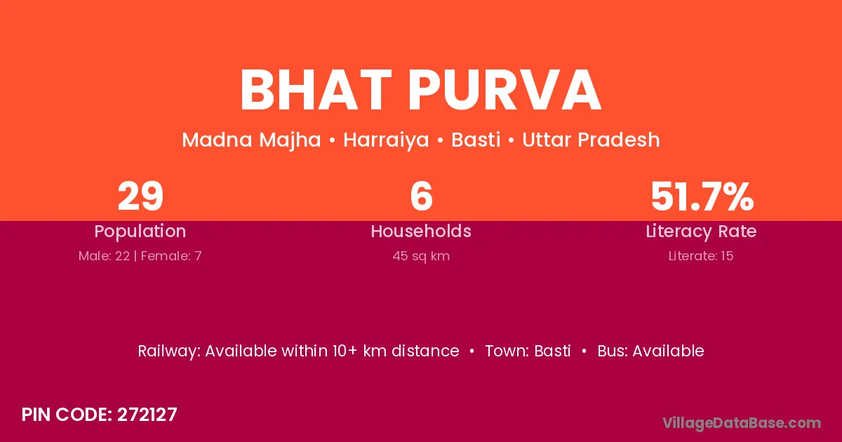 The literacy rate of Bhat Purva village is 66.74%. Male literacy stands at 76.15% and female literacy at 56.56%.