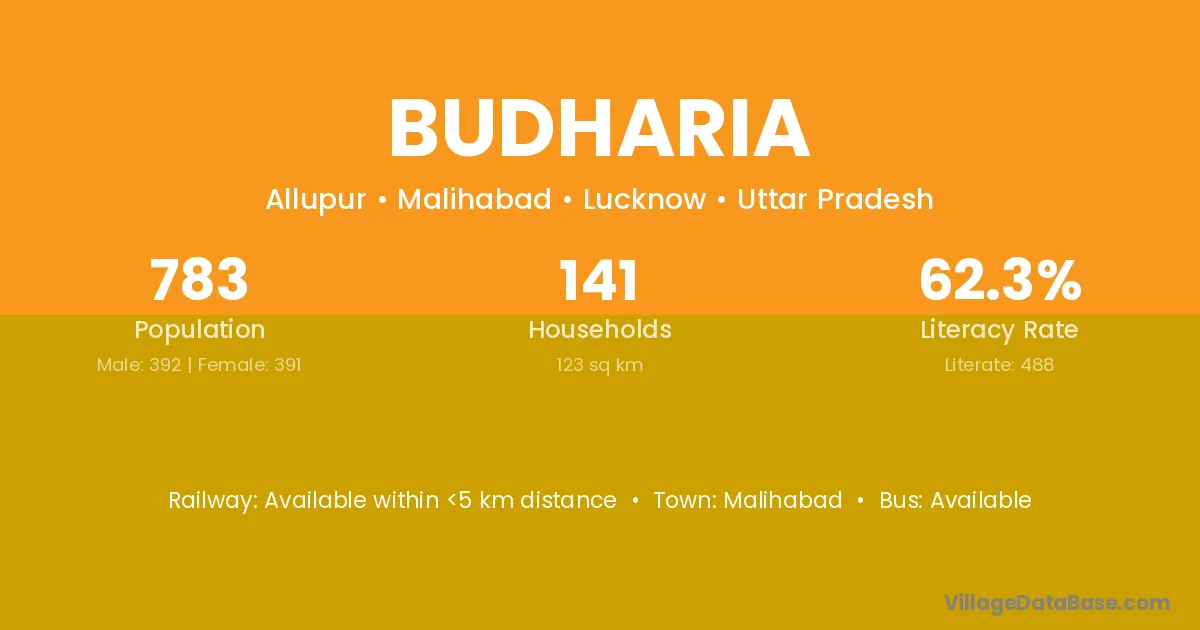 Budharia village has a total population of 783 people, of which 392 are males and 391 are females.