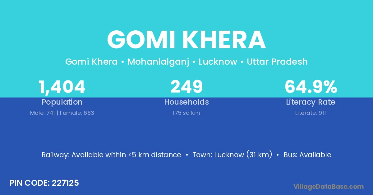 Lucknow (31 km) is the nearest town to Gomi Khera village for major economic activities and is located approximately 31 km away.