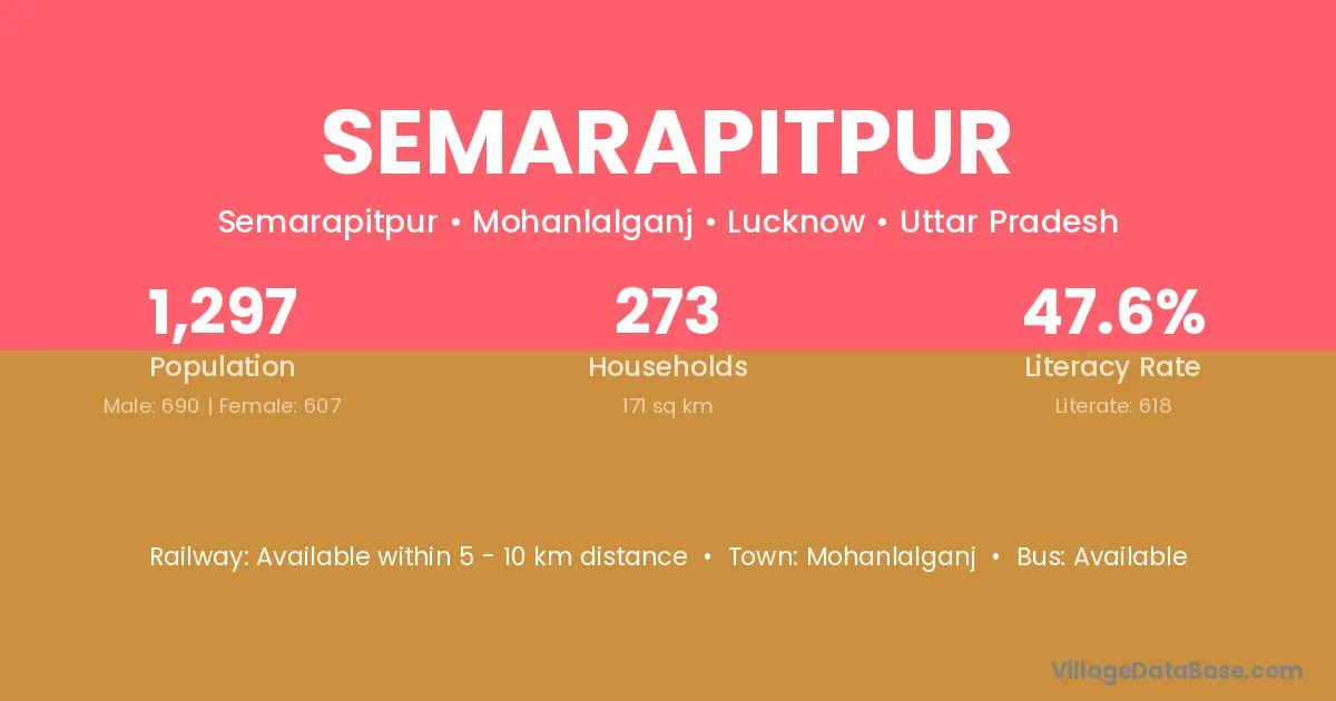 Semarapitpur village has a total population of 1,297 people, of which 690 are males and 607 are females.
