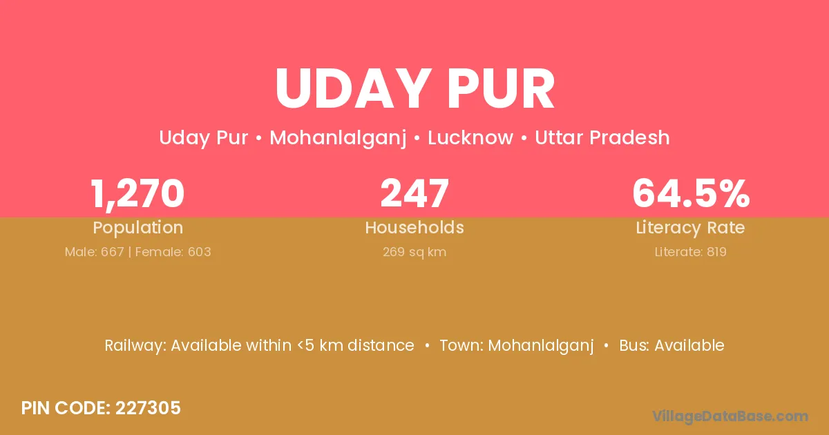 Uday Pur village has a total population of 1,270 people, of which 667 are males and 603 are females.