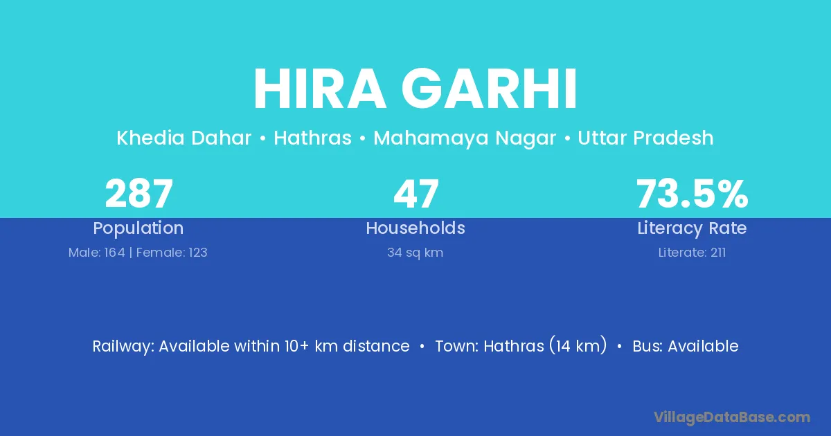 Hathras (14 km) is the nearest town to Hira Garhi village for major economic activities and is located approximately 14 km away.