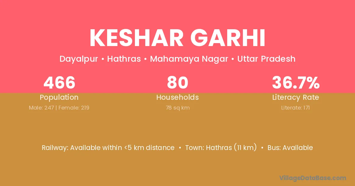 Hathras (11 km) is the nearest town to Keshar Garhi village for major economic activities and is located approximately 11 km away.