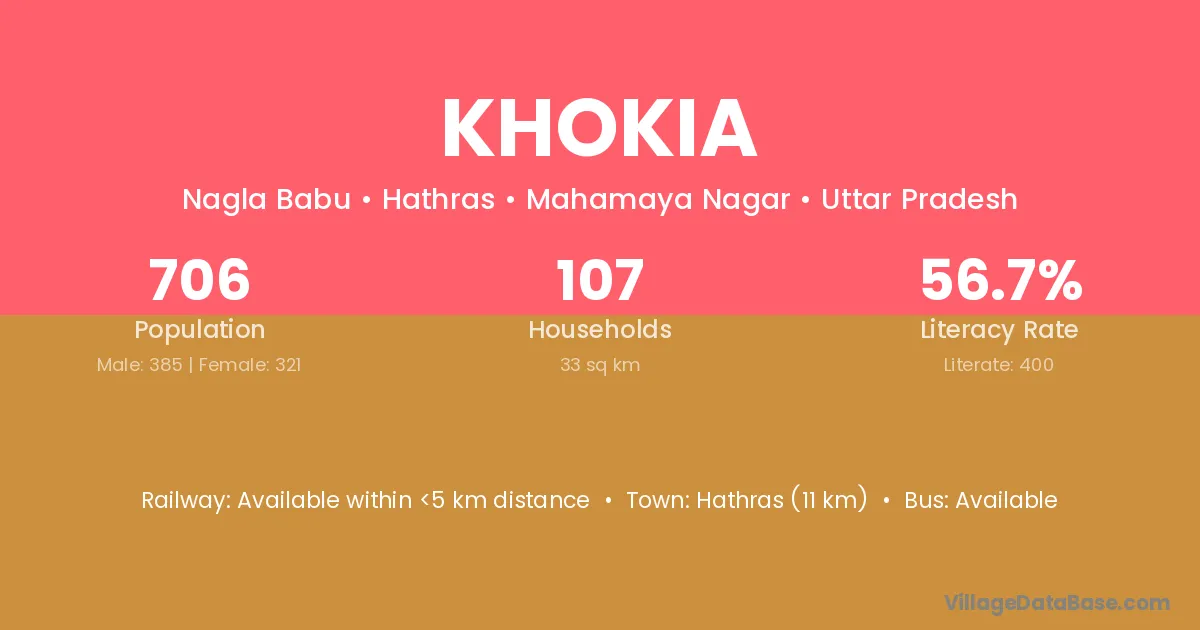 Hathras (11 km) is the nearest town to Khokia village for major economic activities and is located approximately 11 km away.