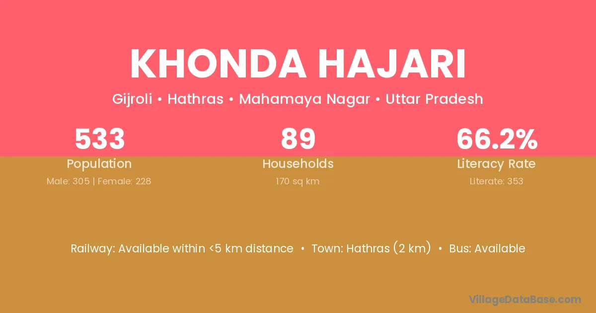 Hathras (2 km) is the nearest town to Khonda Hajari village for major economic activities and is located approximately 2 km away.