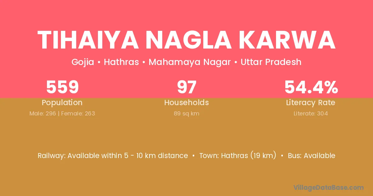 Hathras (19 km) is the nearest town to Tihaiya Nagla Karwa village for major economic activities and is located approximately 19 km away.