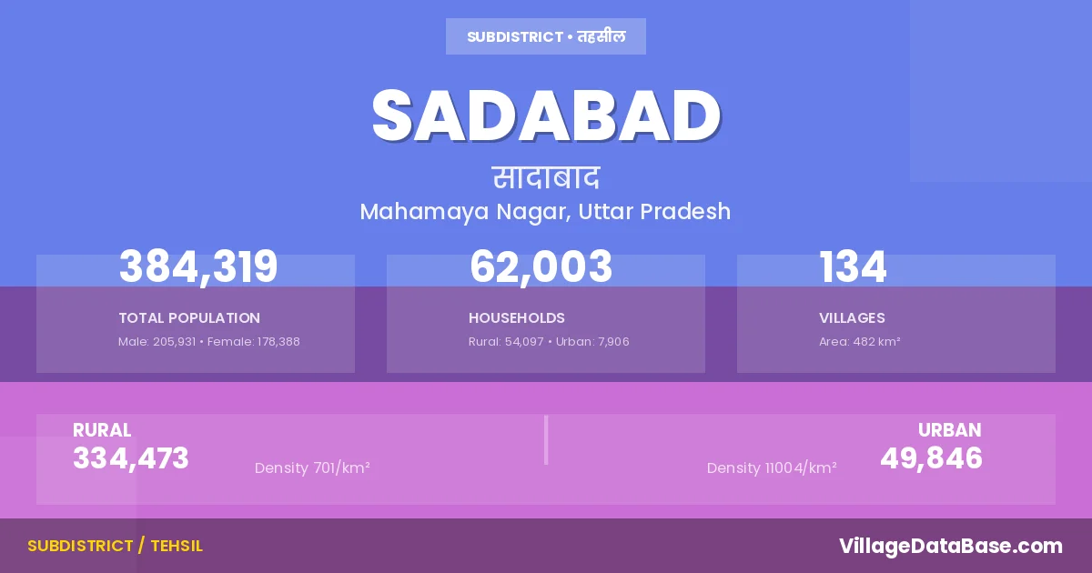 According to the 2011 census The total area of Sadabad Tehsil is 482 km², with a population of 384319 people. The population density is 798 inhabitants per square kilometre, and there are approximately 62003 houses in the sub district.
