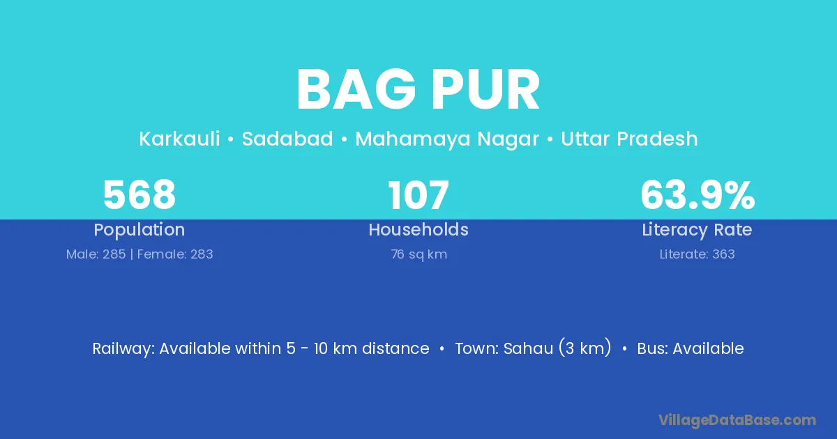 Sahau (3 km) is the nearest town to Bag Pur village for major economic activities and is located approximately 3 km away.