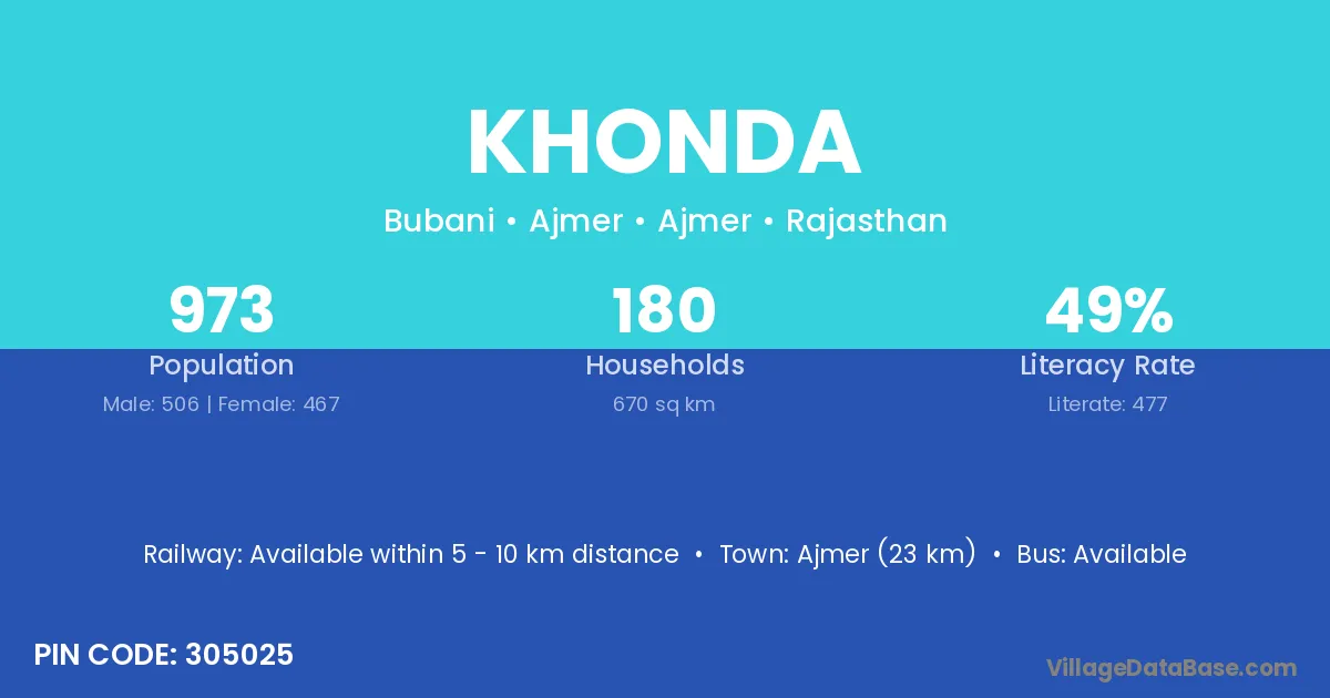 The literacy rate of Khonda village is 57.29%. Male literacy stands at 69.00% and female literacy at 43.41%.