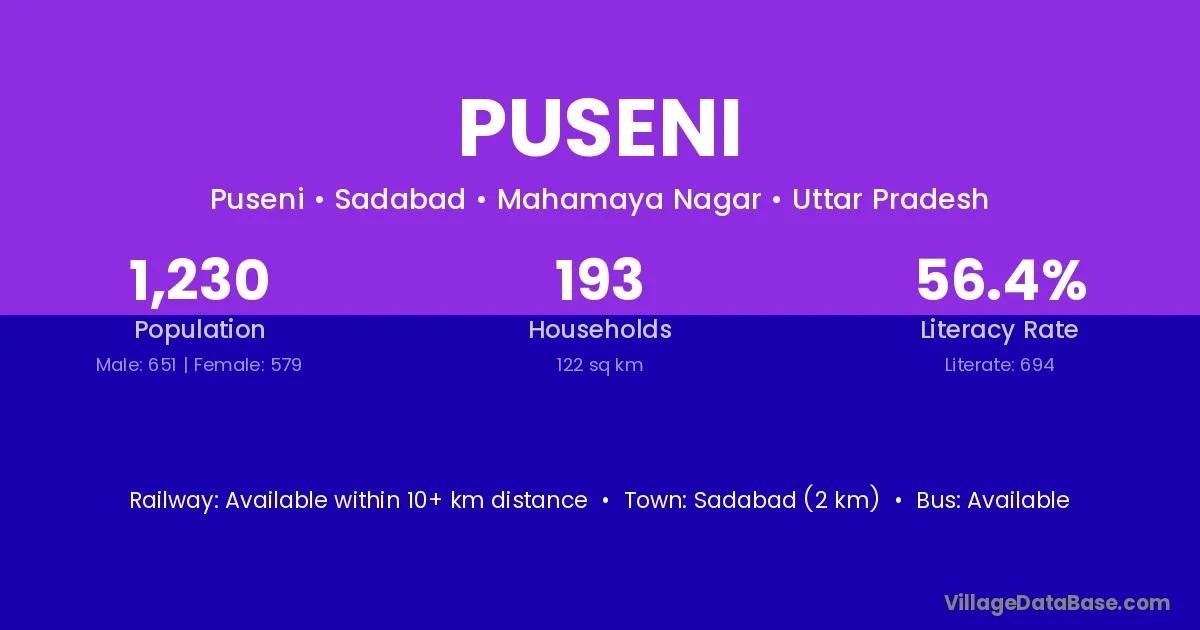Sadabad (2 km) is the nearest town to Puseni village for major economic activities and is located approximately 2 km away.