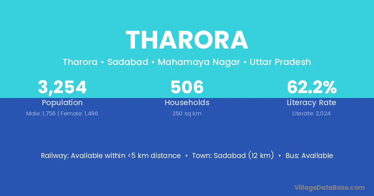 Sadabad (12 km) is the nearest town to Tharora village for major economic activities and is located approximately 12 km away.