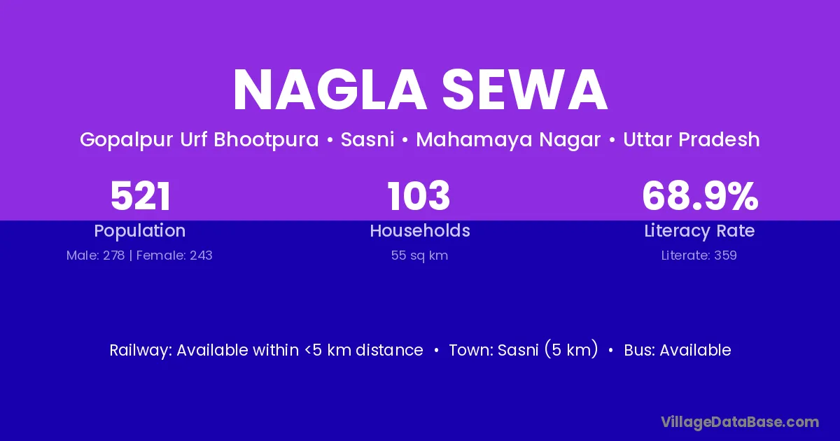 Sasni (5 km) is the nearest town to Nagla Sewa village for major economic activities and is located approximately 5 km away.