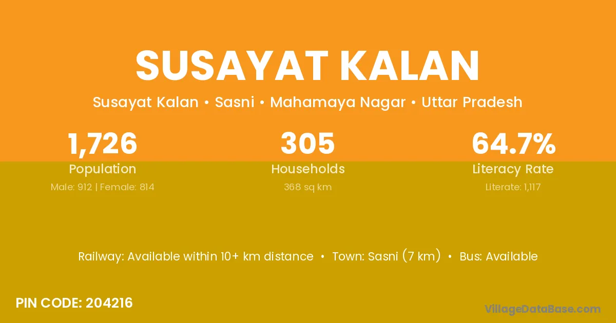 Sasni (7 km) is the nearest town to Susayat Kalan village for major economic activities and is located approximately 7 km away.
