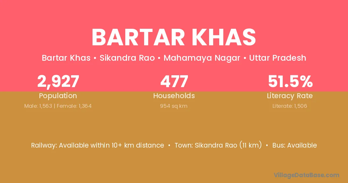 Sikandra Rao (11 km) is the nearest town to Bartar Khas village for major economic activities and is located approximately 11 km away.