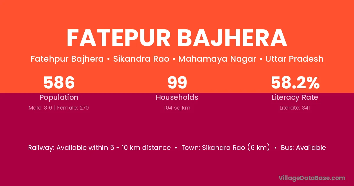 Sikandra Rao (6 km) is the nearest town to Fatepur Bajhera village for major economic activities and is located approximately 6 km away.