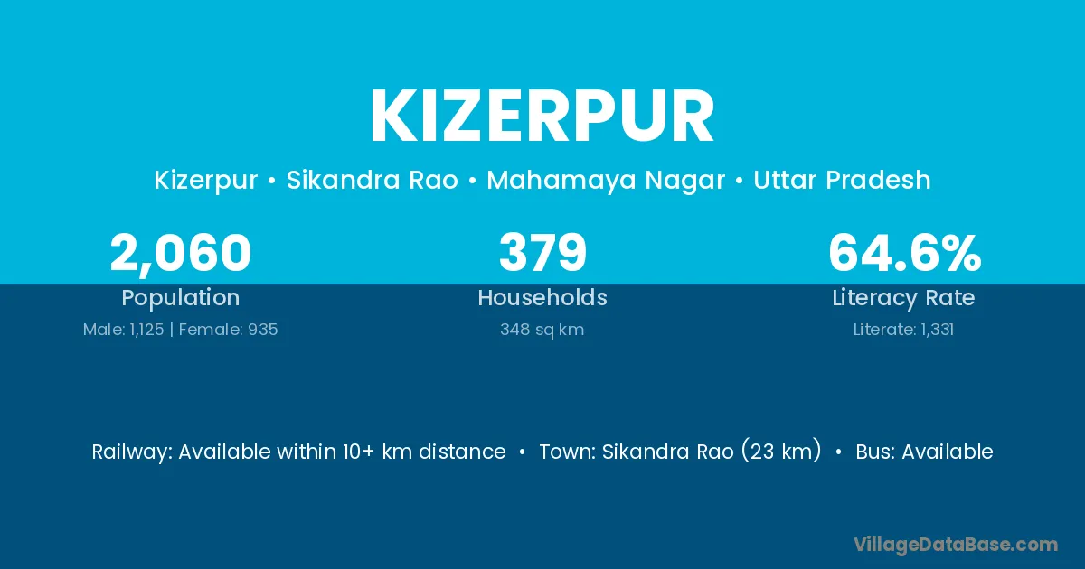 Sikandra Rao (23 km) is the nearest town to Kizerpur village for major economic activities and is located approximately 23 km away.