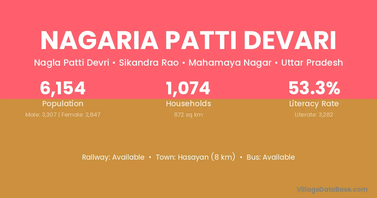 Nagaria Patti Devari village has a total population of 6,154 people, of which 3,307 are males and 2,847 are females.