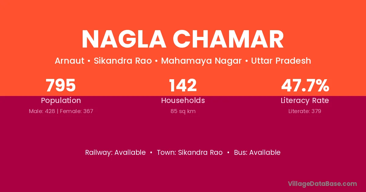 Nagla Chamar village has a total population of 795 people, of which 428 are males and 367 are females.