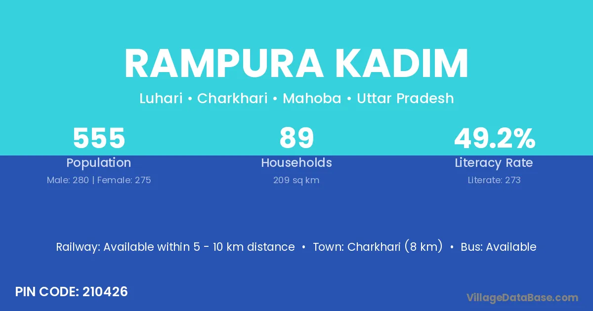 Charkhari (8 km) is the nearest town to Rampura Kadim village for major economic activities and is located approximately 8 km away.