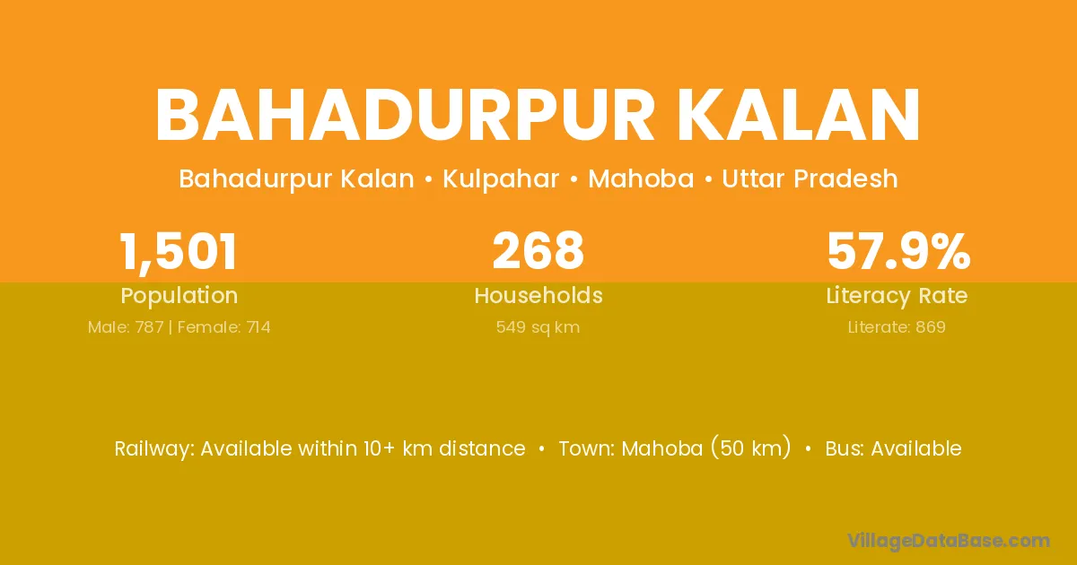 Mahoba (50 km) is the nearest town to Bahadurpur Kalan village for major economic activities and is located approximately 50 km away.